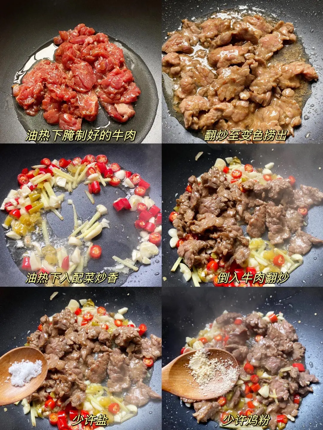 快速翻炒十几下,让牛肉和配菜充分融合,味道更加均匀。
