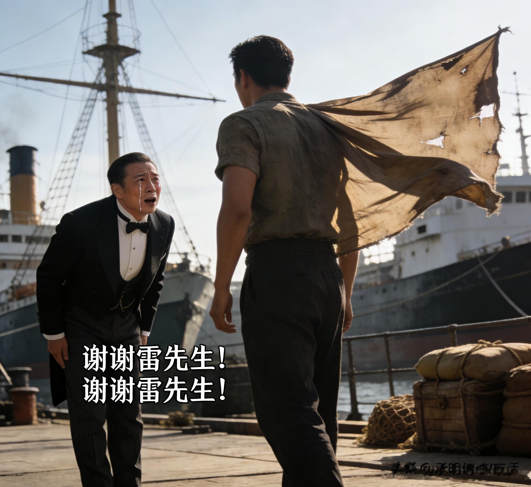 周管家的眼泪一下子掉下来,连连鞠躬:“谢谢雷先生!谢谢雷先生!”雷振邦转身往码头出口走,风把他的短褂吹得鼓起来,像面破旗子。路过街边的馄饨摊时,他忽然停住——蒸汽里,他看见周管家身后的巷口,有个穿月白旗袍的影子,攥着帕子的手在抖,发间的珍珠簪子因为颤抖,反射出一点碎光。