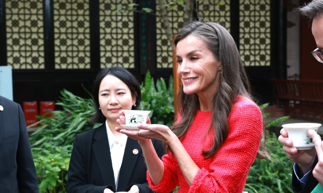 11月11日,王后莱蒂齐亚在工作人员的陪同下前往成都望江楼公园参观访问,出席西班牙诗人安东尼奥·马查多诞辰150周年纪念活动。