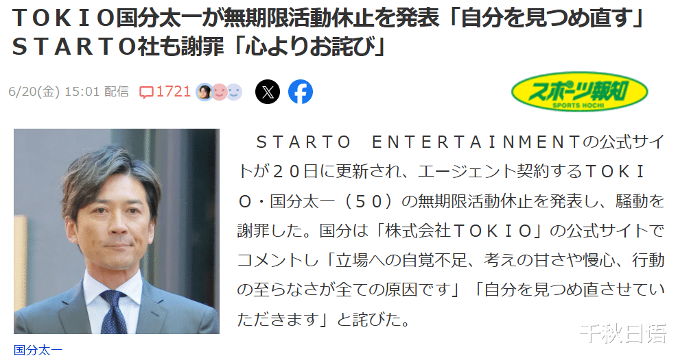 今天(6月20日),日媒报道START ENTERTAINMENT(原杰尼斯)宣布与旗下签约艺人TOKIO成员国分太一(50岁,出道30年)无限期停止活动,并就此次风波致歉。国分太一在株式会社TOKIO官网发布声明称:"此次事件的根本原因在于我对自身立场的认知不足、思想松懈傲慢以及行为失当",并表示"将暂停一切活动以深刻反省"。
