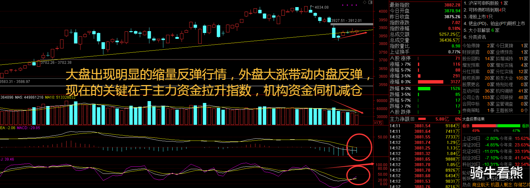 欧美股市反弹力度较强,市场开始预测“七姐妹”的年底业绩大增,谷歌、英伟达等科技公司开始发布“黑科技”,中美会谈关系缓和,这一系列的利好带动美股上涨,骑牛看熊认为这一轮美股是反转新高的走势,要注意风向变化。A股市场反弹力度相对较差,主要还是成交量的进一步萎缩,没有资金助推很难走高,再加上国内机构考虑的是年底“名次”,反而在本周选择逢高减仓,这就导致了一些个股出现反向走势,现阶段仍然还是谨慎看多的操作思路。