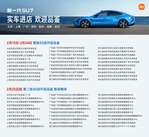 据CNMO了解,据CNMO了解,即日起,首批覆盖北京、上海、广州、深圳、杭州、成都和武汉的30家小米门店,将率先展示这款新车。根据规划,第二批30家门店也将在2月25日迎来新一代SU7的展车,覆盖城市与首批相同。而在新一代SU7正式上市之前,小米还将继续扩大展示范围,更多城市的门店将陆续开启新车展示。