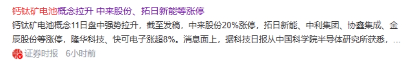 受此消息的影响,钙钛矿电池板块大涨,中来股份20%涨停,拓日新能、中利集团、协鑫集成、金辰股份等涨停。