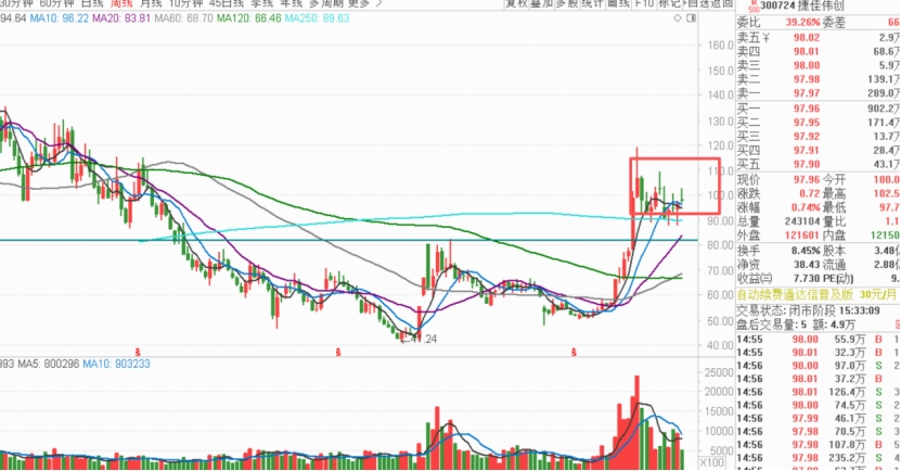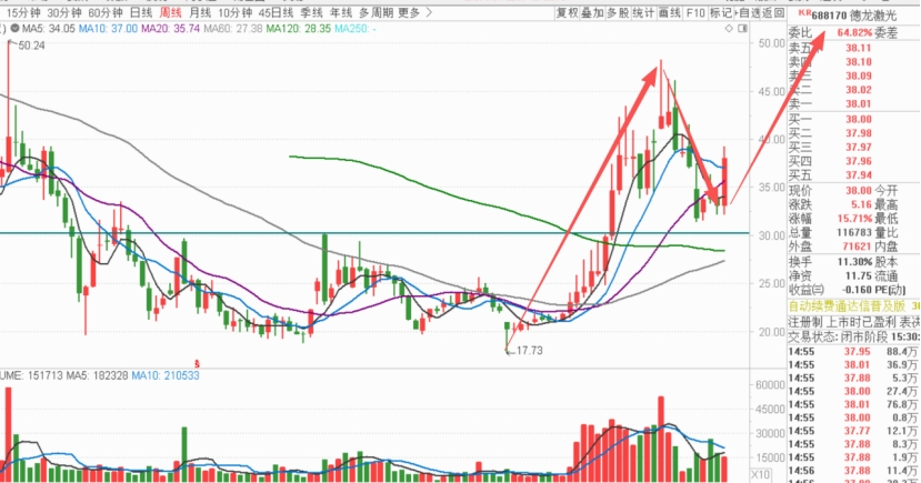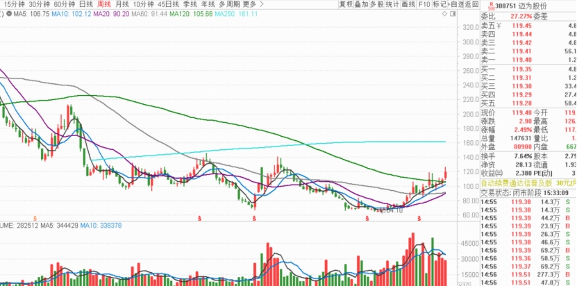 技术分析:从周线上看,目前处于回调后的二次上涨刚开始,60周均线即将与120周均线粘合形成金叉,中期上行趋势保持完好,第二波行情即将开启。