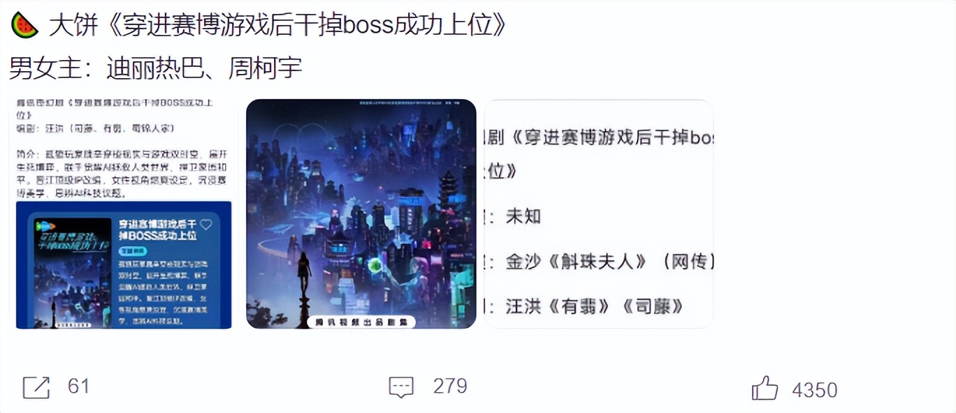 从传出的消息上看,这部剧是嘉行制作的,所以消息的可信度还是非常高的,最关键的是,《狙击蝴蝶》播出的时候,《穿进赛博游戏后干掉boss成功上位》还给周柯宇包场了。