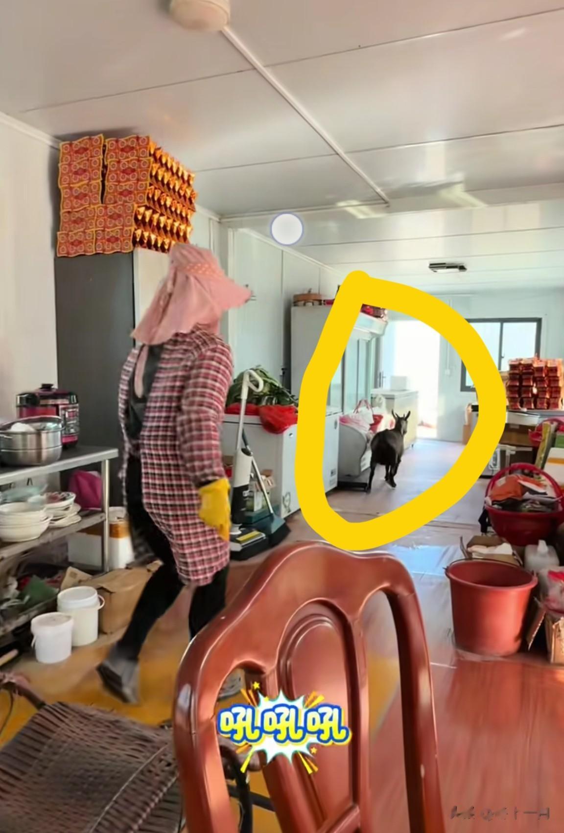 这只大黑羊进屋了,扒到了冰柜上。