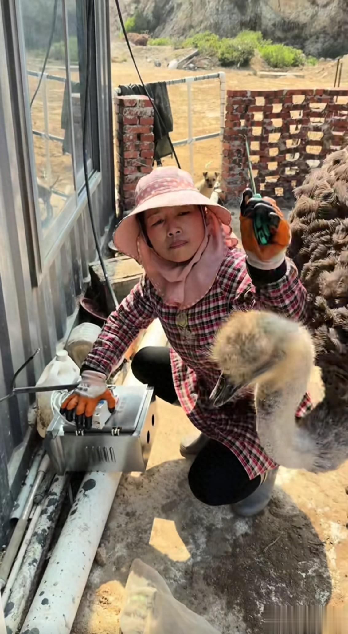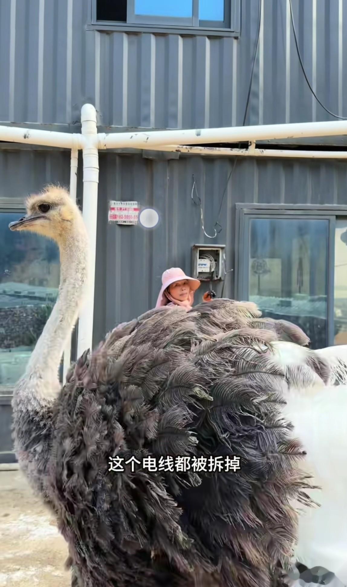 海军妈妈在修电路箱,旁边宠物鸵鸟芭乐的大脑袋探了出来,海军妈妈扬手作势要打芭乐,这是为啥呢?