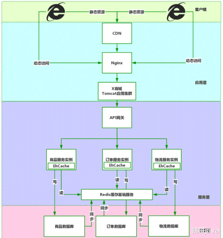 当然,缓存可不只有用内存替代硬盘这一种形式,在分布式架构下缓存在每一层都有自己的设计,下面咱们通过这个微服务的多级缓存架构图为主线进行讲解。