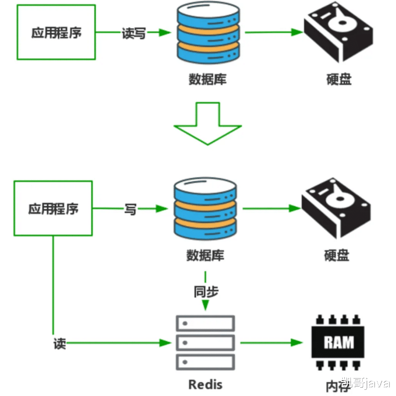 假设应用程序将原始数据存储在 MySQL 数据库中。众所周知 MySQL 数据库会将数据存储在硬盘以防止掉电丢失,但是受制于硬盘的物理设计,即便是目前性能最好的企业级 SSD 硬盘,也比内存的这种高速设备 IO 层面差一个数量级,而以淘宝、京东这种电商为代表的互联网应用,都是典型的 “读多写少” 的场景,因此我们需要在设计上进行数据的读写分离,在数据写入时直接落盘处理,而占比超过 90% 的数据读取操作时则从以 Redis 为代表的内存 NoSQL 数据库提取数据,利用内存的高吞吐瞬间完成数据提取,这里 Redis 的作用就是我们常说的缓存。