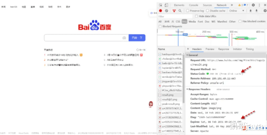 我们以百度 Logo 图片为例,百度在 HTTP 通过 Expires 响应头控制静态图片的有效期。Expires 代表过期时间。当前百度 Logo 的过期时间为 2031 年 2 月 8 日 9 时 26 分 31 秒。在这个时间段内,浏览器会将图片以文件形式缓存在本地,再次访问时会看到“from disk cache”的提示,此时浏览器不再产生与服务器的实际请求,会从本地直接读取缓存图片。通过在浏览器端设置 Expires 可以在很大程度减少重复请求静态资源带来的带宽损耗,这在高并发 Web 应用中是基础而重要的设置。