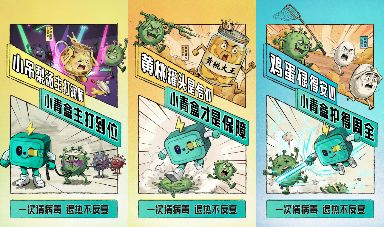 除了动画短片,一系列以“偏方缓解情绪,小青盒整顿流感”为基调的场景海报,深入春运旅途、家庭团聚、返工筹备等具体情境,进一步柔和地嵌入了产品认知。这一系列动作,旨在降低公众对药品信息的心理距离,建立品牌亲切感。