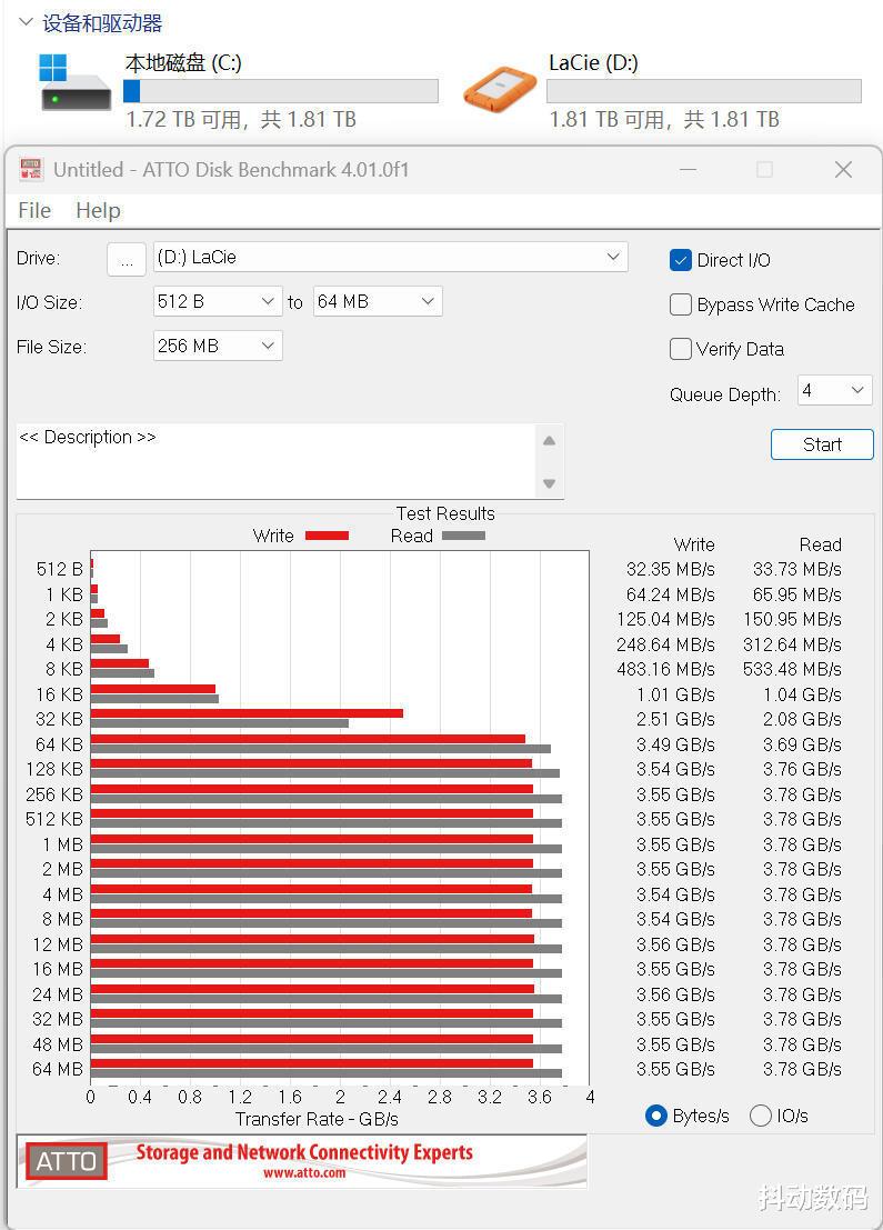 ATTO测试雷孜LaCie Rugged SSD4金刚钻Plus读写测试,不同数据块大小的顺序读写性能。可以看到随着数据块增大到64K时,LaCie Rugged SSD4的读写速度就已经可以稳定在3.5 GB/s以上,后续读写速度稳定,未见明显波动。
