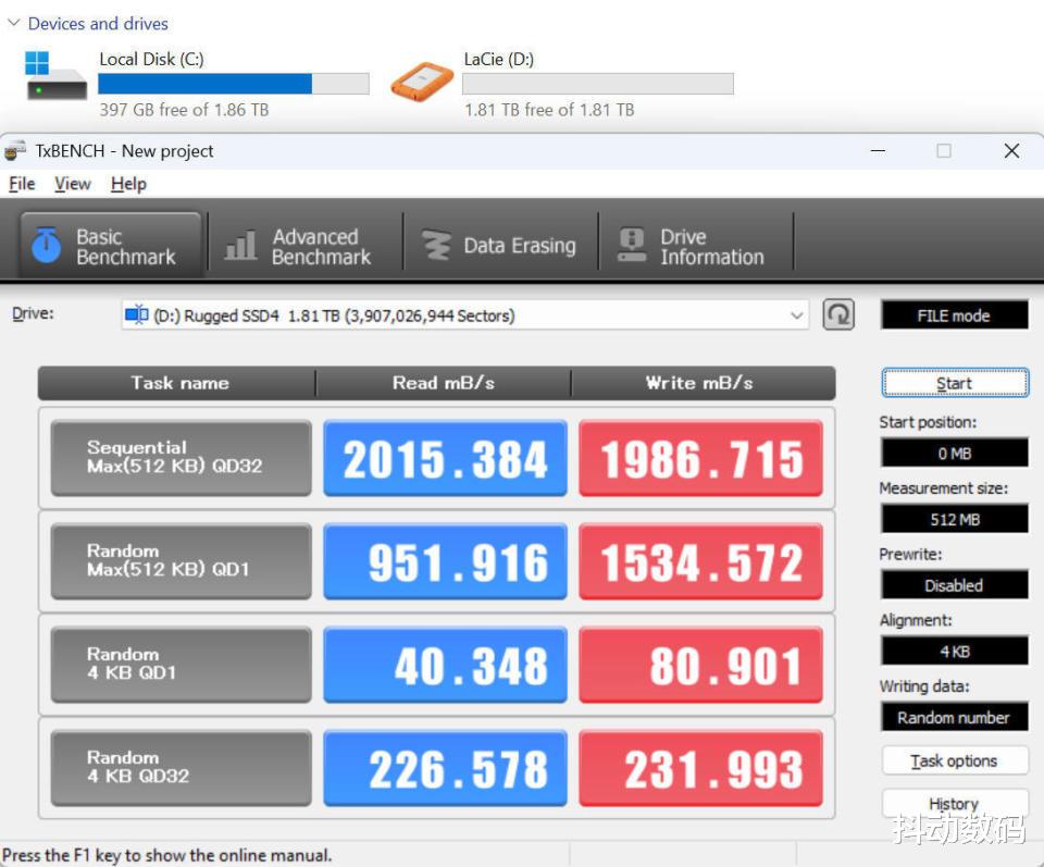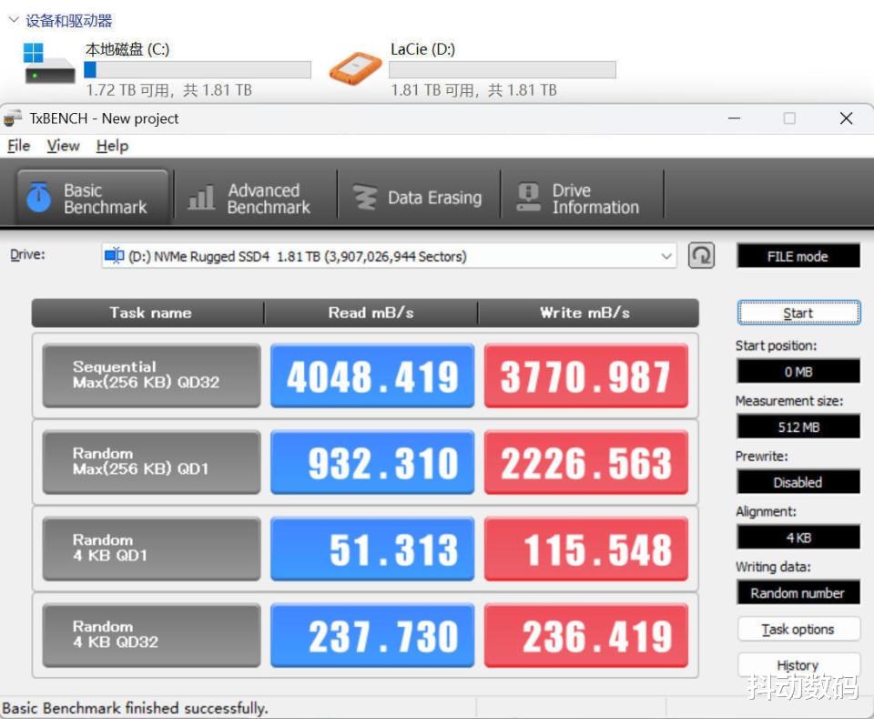 实测在Windows 阵营下已经有很多设备开始支持USB 4接口了,在USB 4接口下测试雷孜LaCie Rugged SSD4金刚钻Plus读写表现如图,读取速度轻松达到4000MB/s的峰值,写入速度也达到了3770MB/s。
