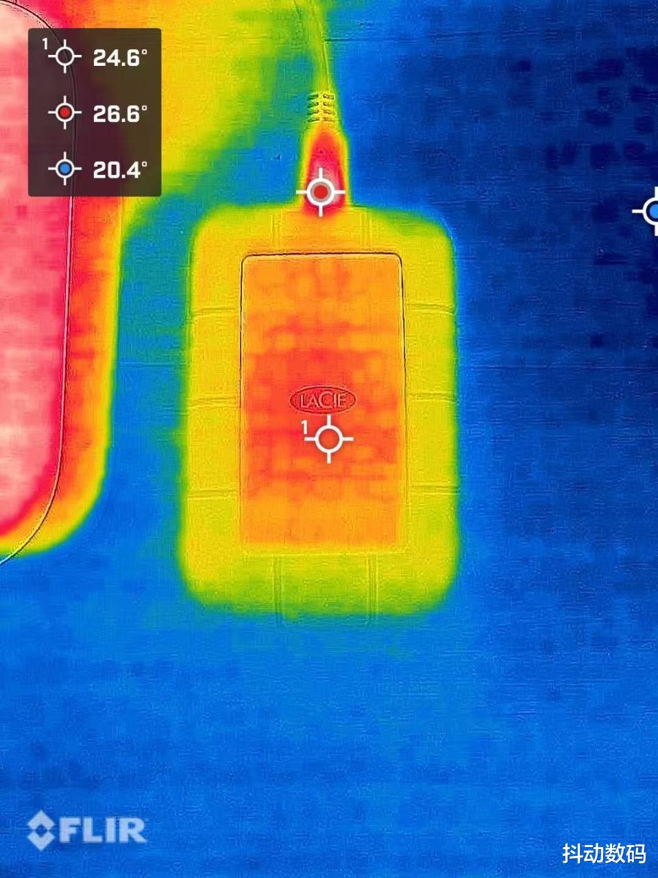 通过红外成像仪可以看到在测试时雷孜LaCie Rugged SSD4金刚钻Plus的发热情况,中心最高温度为26.6 ℃,表面体感温度在冬天非常低。
