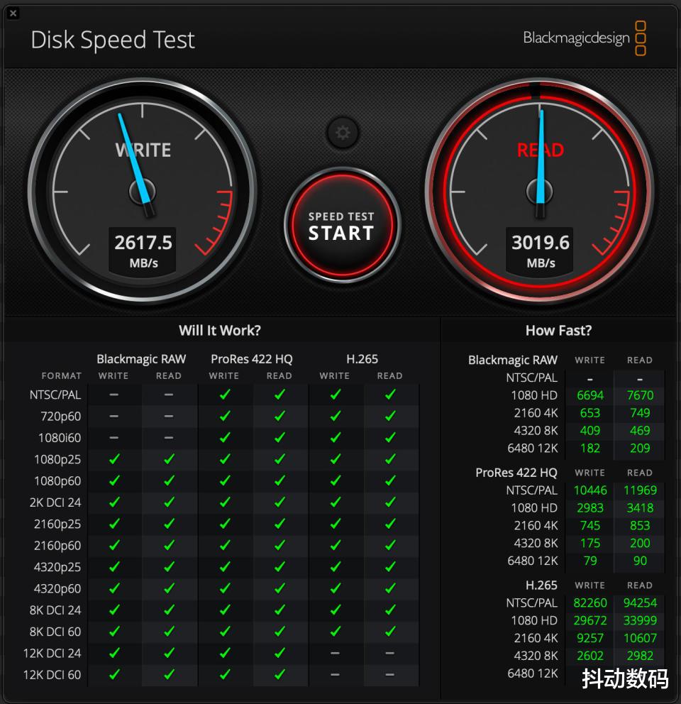 Blackmagic Disk Speed Test软件下,写入2617.5 MB/s、读取速度为3019.6 MB/s。