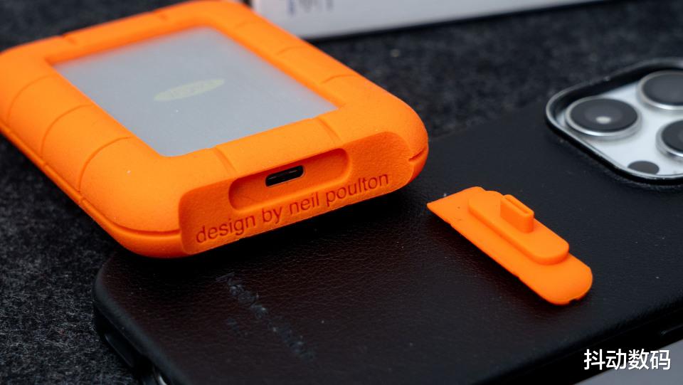 硬盘尺寸不大,大概105x67x17mm,仅手掌大小。雷孜LaCie Rugged SSD4金刚钻Plus采用坚固的金属材质外壳,外覆一圈醒目的橘色橡胶防护套。外壳边缘采用圆弧倒角设计,橡胶防护套表面另设有防滑凹槽纹理。