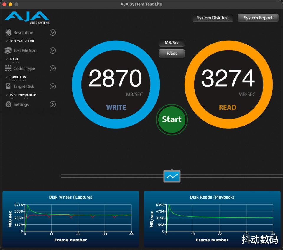 回到Mac 电脑端,测试的主机为支持雷电 4协议的Mac mini。通过读写测试可以看到虽然雷电 4接口与USB 4接口相互是有兼容协议的,但是测试表现上读写还是受到带宽限制,在Mac系统下读写测试表现如图。读取可以达到3200MB/s,写入则在2900MB/s上下徘徊。