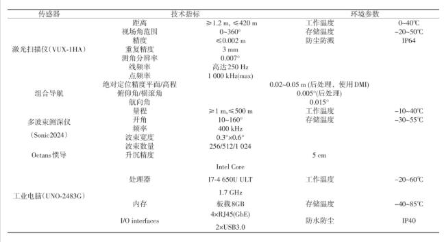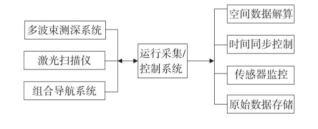 水上水下一体化测量系统为整个测量系统的核心,主要负责采集和记录各类传感器数据。其设计原理如图2所示,主要包括激光扫描仪、多波束测深系统和组合导航系统。测量人员通过操控软件,控制安装在无人船上的水上水下一体化测量系统进行数据采集。具体传感器参数如表1所示。
