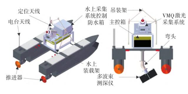 基于无人船的水陆一体化测量系统以无人船为载体,集成了GNSS、多波束测深仪、激光扫描仪、高精度惯性导航等多种高精度传感器,可选用自动驾驶和远程遥控两种方式对无人船进行控制,采用无线传输的方式,可实时接收并分析处理所采集数据。系统主要由无人船系统、水上水下一体化测量系统和岸基系统3个部分组成,具体如图1所示。