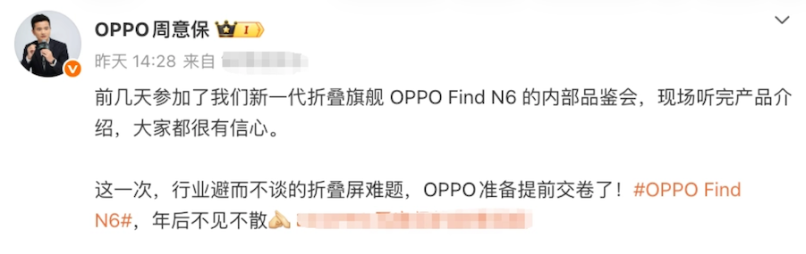 作为苹果“偷师”的对象,OPPO Find N5的迭代新品Find N6将在春节后亮相(OPPO Find系列负责人周意保确认消息),Find N6目前已经入网,据曝料该机在技术上有望实现多项突破。从周意保的预热互动来看,Find N6聚焦于行业避而不谈的折叠屏难题,同时保持轻薄手感和强大配置体验!