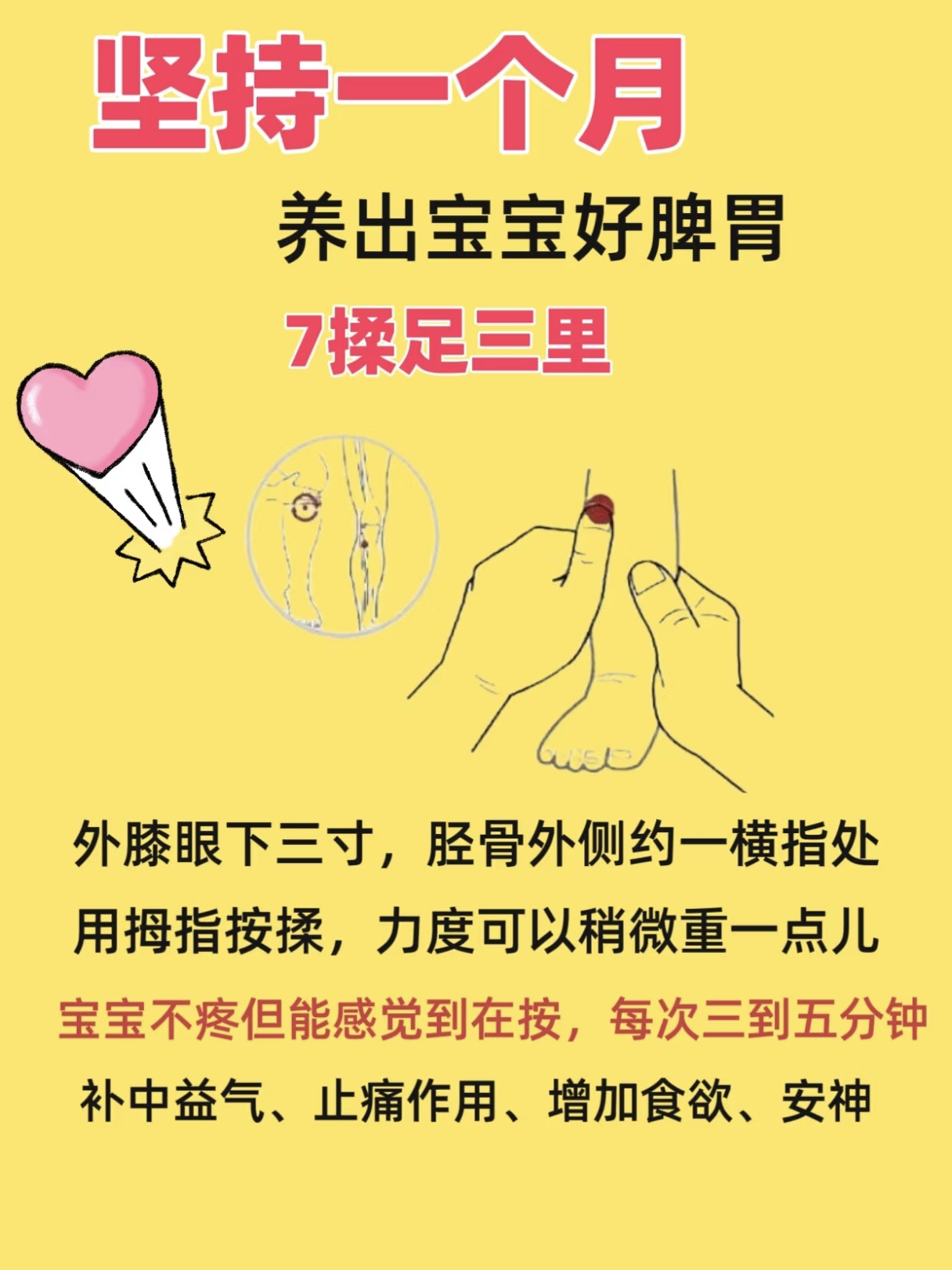 膝盖外侧有个重要穴位,外膝眼往下约三指宽、胫骨外侧的区域,这个位置按起来稍微有点力度,但孩子不会觉得疼,反而会感觉暖暖的。每天按揉几分钟,对提升整体精气神、缓解肚子不舒服很有帮助,还能让孩子睡觉更安稳。
