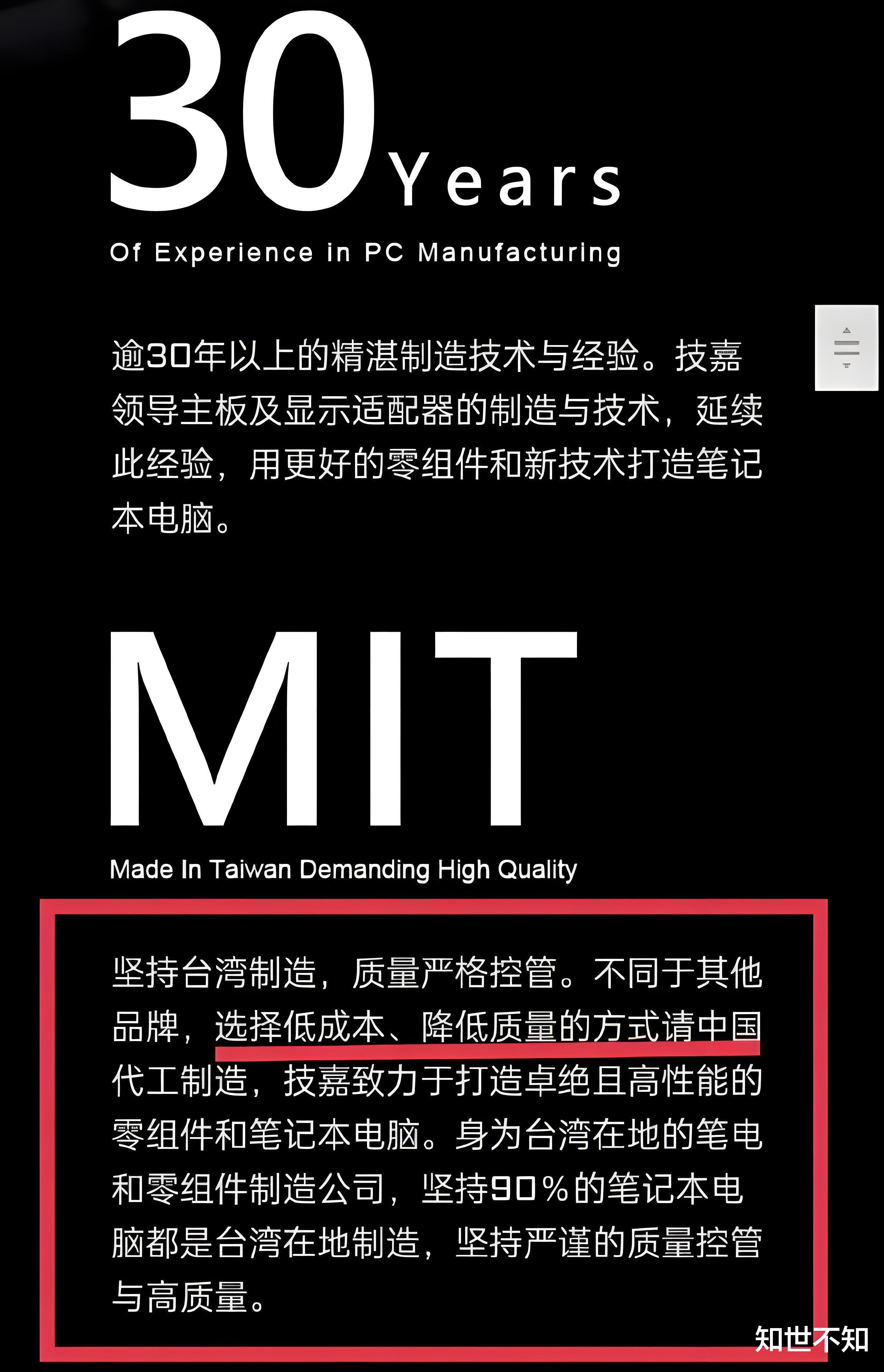 长荣桂冠酒店绝对不是个例,同为台湾省企业的电脑硬件厂商「技嘉」,在2021年官网更新产品宣传图片时,就有网友发现,技嘉的笔记本部门不仅在宣传图中大肆宣传“台湾制造”,还明确表示:“技嘉坚持台湾制造,质量严格控管。不同于其他品牌,选择低成本、降低质量的方式请中国代工制造”。