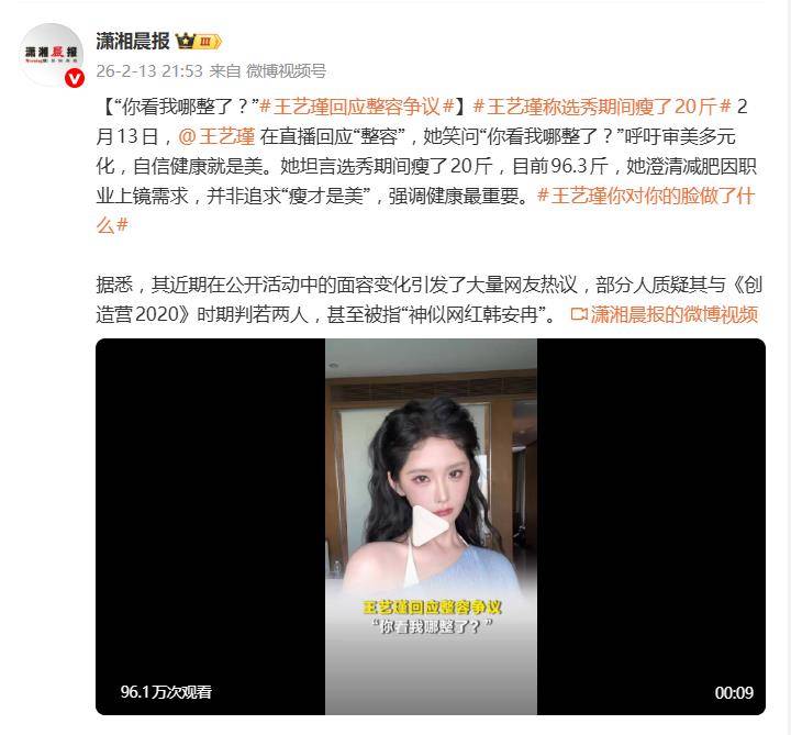 一句“你看我哪整了?”,让王艺瑾的直播间瞬间成了审美辩论场。2月13日,面对近期铺天盖地的“变脸”质疑,这位女艺人选择在直播中正面硬刚,将容貌变化全数归因于“为职业瘦身20斤”,并呼吁大众跳出单一审美。但这番解释,似乎并未完全平息网友将她与“网红脸”划上等号的争议。