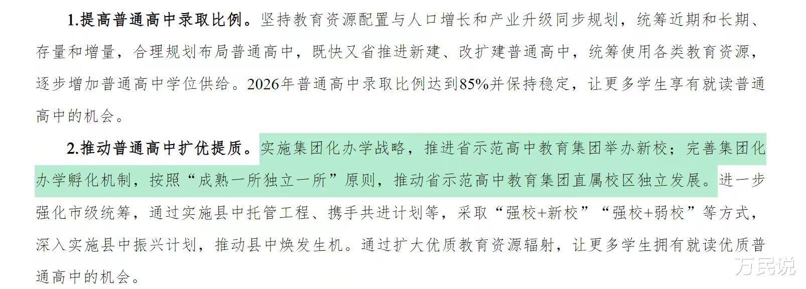 这一切的答案,都藏在合肥市教育局发布的《合肥市深化高中阶段学校考试招生制度改革的实施意见》。关于普高扩优提质,文件写得清清楚楚:实施集团化办学战略,推进省示范高中教育集团举办新校;完善集团化办学孵化机制,按照“成熟一所独立一所”原则,推动省示范高中教育集团直属校区独立发展。