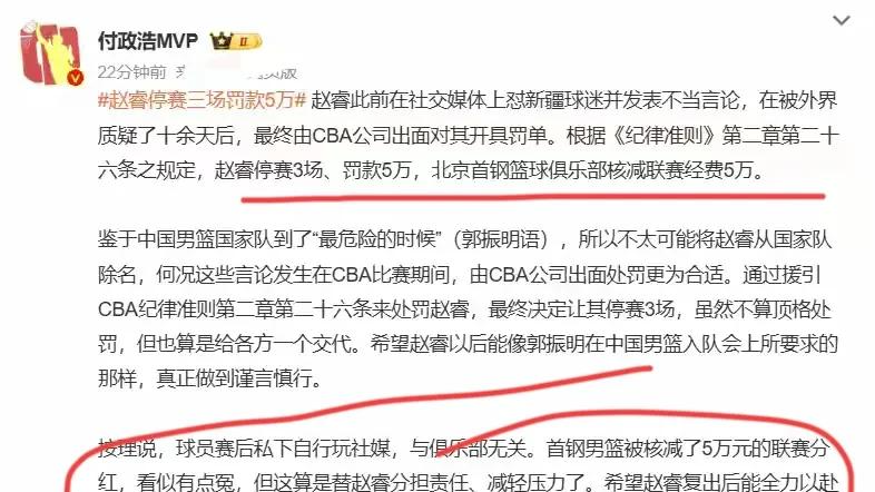 这件事情对于北京首钢男篮来讲可以说是晴天霹雳,对于春节后的第二阶段CBA常规赛将会带来更大的影响。而CBA对于赵睿的处罚结果,很显然有部分球迷并不买账。认为这样的处罚结果对于赵睿来讲只是小儿科。并且在评论区也发表了对于这件事情的一些看法。