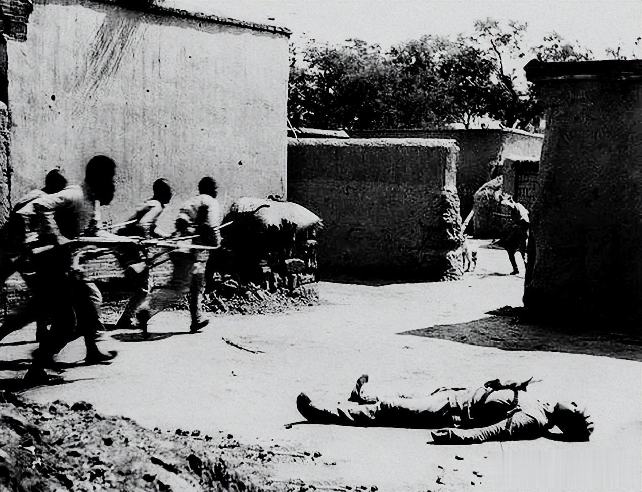 中国翻译的话说完片刻后,人群始终保持着沉默。森冈大队长手一挥,两个青年被拉出了队伍,拖拽着来到了台前。中国翻译对他们好言相劝,让他们指认八路军和物资的储藏地点。两个青年皆异口同声说“不知道”,森冈大队长下令枪杀了两名青年。