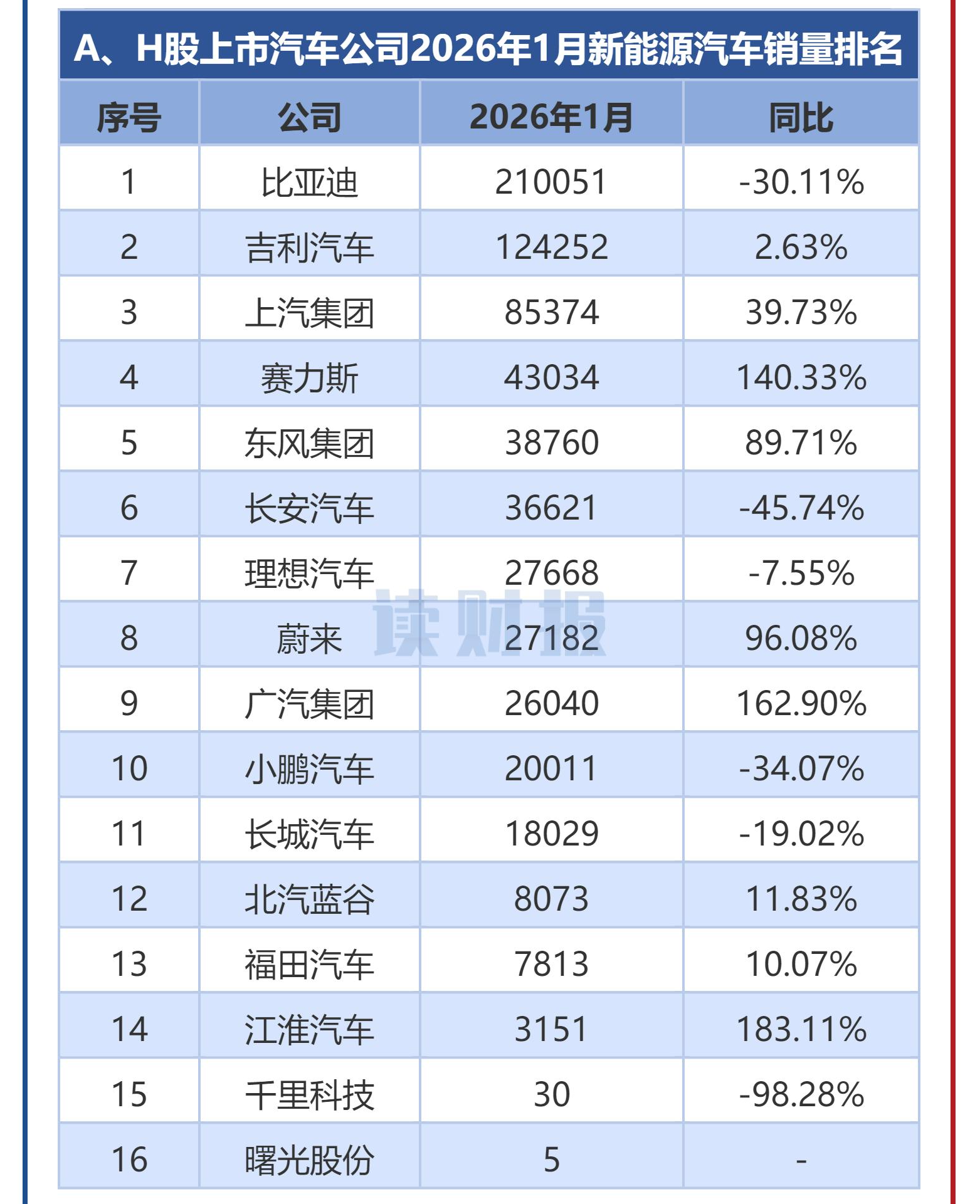 图4:A、H股上市汽车公司2026年1月新能源汽车销量排名