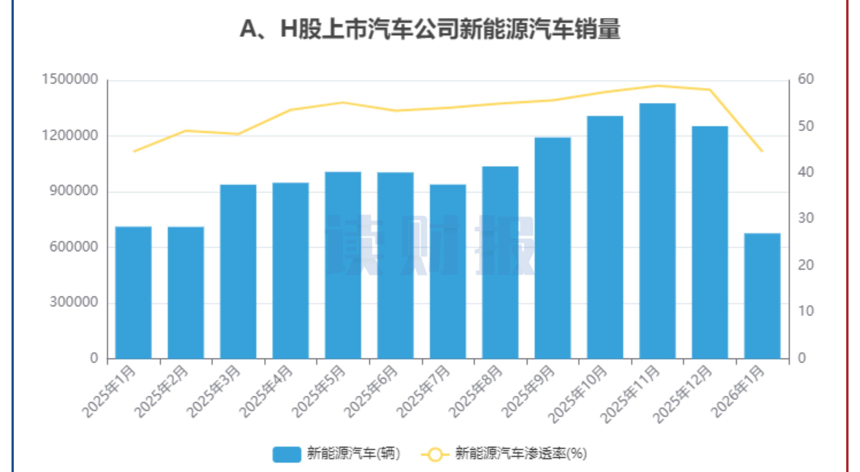 2026年1月,20家A、H股上市车企合计实现整车销量154.89万辆,同比下降4.61%,环比下降30.4%。
