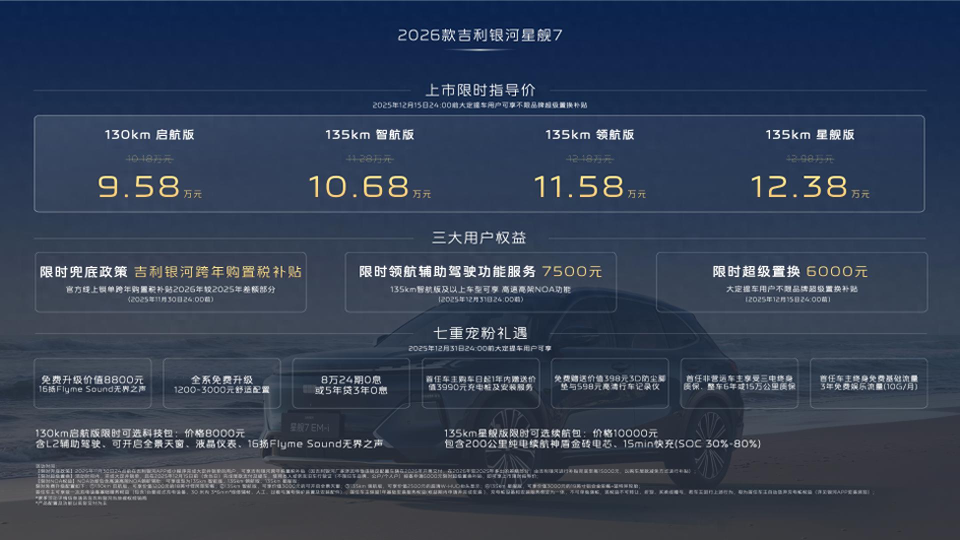 2026款吉利银河星舰7 EM-i正式上市了,上市限时指导价9.58万元-12.38万元,这价格在10万级电混SUV里也相当能打了。新车共推出四个版型,分别是130km启航版、135km智航版、135km领航版、135km星舰版,实力派演员聂远也为2026款吉利银河星舰7 EM-i站台代言。