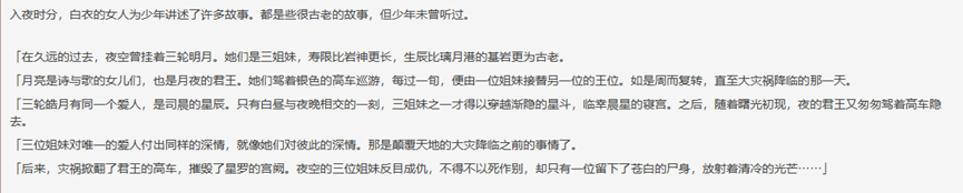 不仅如此,这名角色所讲述的故事是有关于月亮的,在原神提瓦特篇的设定体系中,月亮是非常重要的存在,因为原神的天空是假的,叫虚假之天;在很长一段时间内,原神的月亮也是假的;因此提瓦特的月亮没有阴晴圆缺,都是满月。