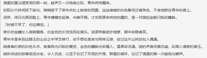 在书里,借由小童山间采药误入竹林偶遇仙人,仙人给她讲述一段故事的叙述视角:
