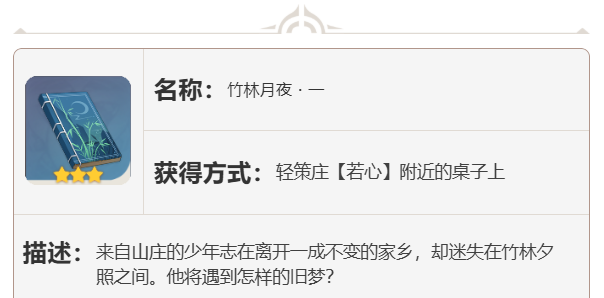 前期留下充分的信息,方便随时从作品内部寻找基本灵感,在理解了这点之后,我们就能进入兹白的叙事编排,在原神开服不久,进入璃月地界的轻策庄,你能在NPC若心附近的桌子上,找到一本叫《竹林月夜》的书:
