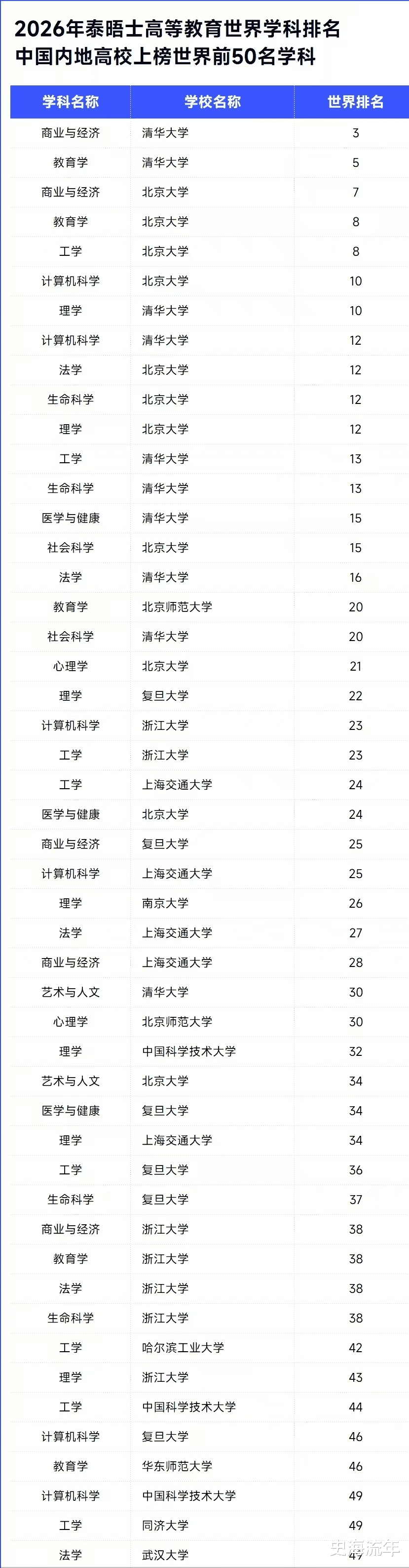 《2026年泰晤士高等教育世界学科排名》的发布,再次将浙江大学推向了全球高等教育舞台的中央。在这份权威榜单中,浙江大学以11个学科上榜、7个学科跻身全球前50的卓越表现,与北京大学、中山大学并列成为中国内地上榜学科总数最多的高校,其计算机科学和工学双双位列全球第23位,商业与经济、教育学、法学、生命科学均排名全球第38位,理学排名全球第46位,综合成绩稳居全国第三。