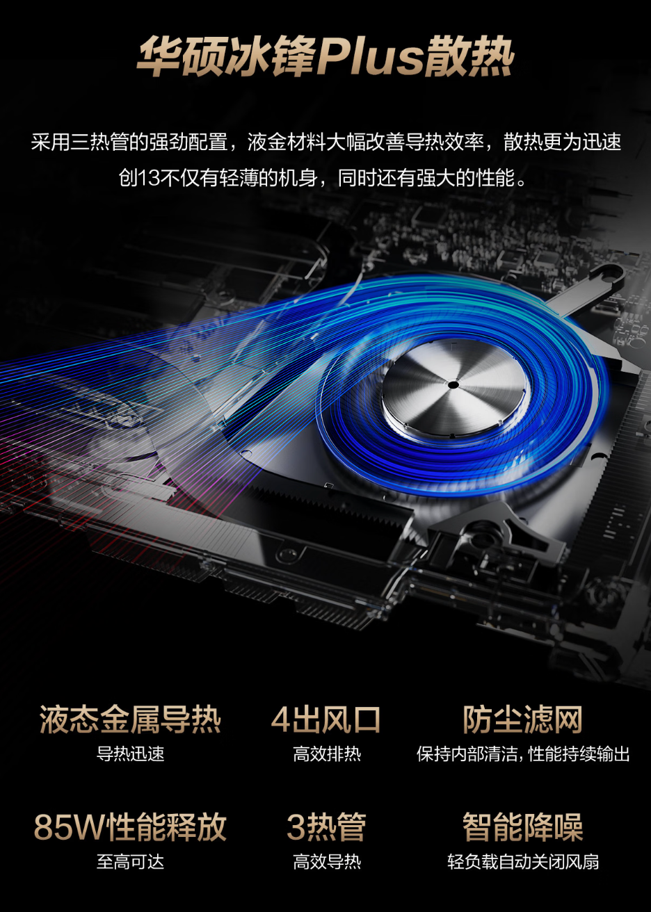 散热方面,配合华硕冰锋Plus散热架构,3热管和液态金属高效导热、4出风口高效排热,保障至高85W强劲性能释放,并支持通过Fn+F快捷切换安静/标准/高效三种模式,进入创作者中心还可DIY设置更强的手动模式,按照用机需求实现自如切换,全场景高能应对。