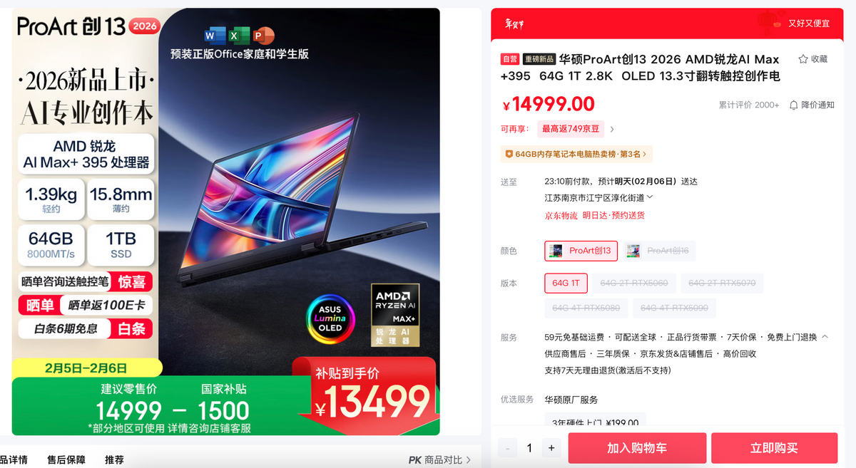#京东重磅新品日#火热售卖中,当前购机,支持晒单咨询送触控笔、返100E卡,白条6期免息等福利,叠加至高1500元国家补贴,到手13499元。心动的小伙伴们可以点击下方链接或者上京东商城搜索#华硕ProArt创13 2026#,获取更多产品信息。