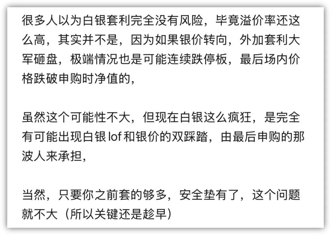 想想白银这场游戏里,白银LOF套利只要早确实是稳赚,但风险就是一旦勾起了人性贪念从而场内买入,这种溢价杀下去就是永久损失,你想等它回来十年八年内几乎是不可能了,财富就此蒸发。