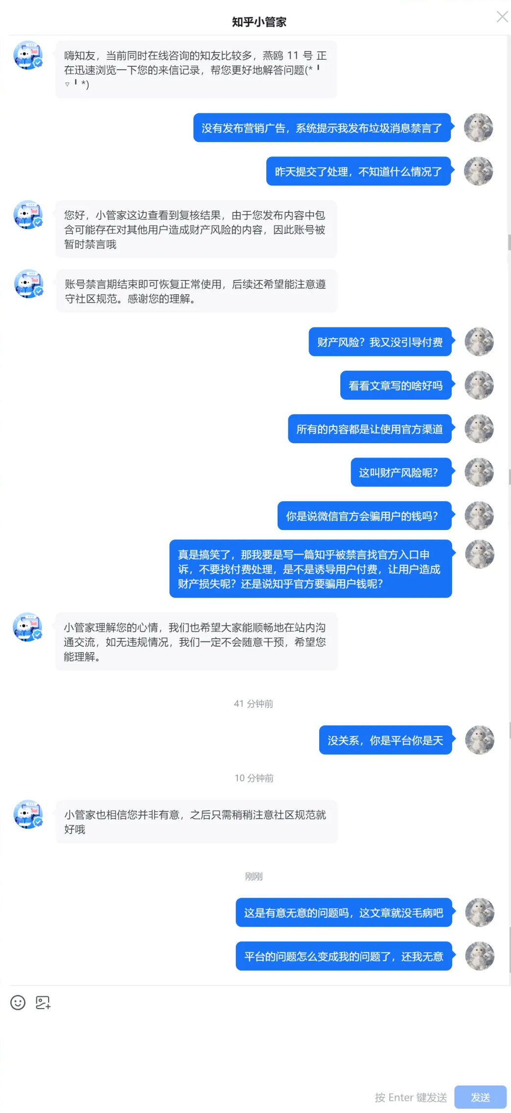 文章投放到其他平台都是正常的,即使出现违规误判,在申诉后也很快解封了,但在投放知乎时,出现了一个令我百思不得其解的情况:这才第三天,就喜提账号禁言7天大礼包,提示是因为「广告营销」,堪称出师未捷身先死~~~