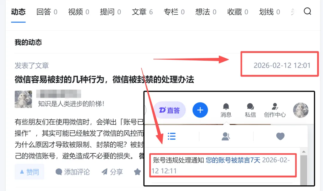 接收到这个提示的时候我还是懵的,心想也没发什么广告信息,然后想了下,很有可能是最近发布的那篇文章的问题,文章发布的时间是「2026-2-12 12:01」,禁言的处置时间是「2026-2-12 12:11」,基本上可以锁定是它的问题了。