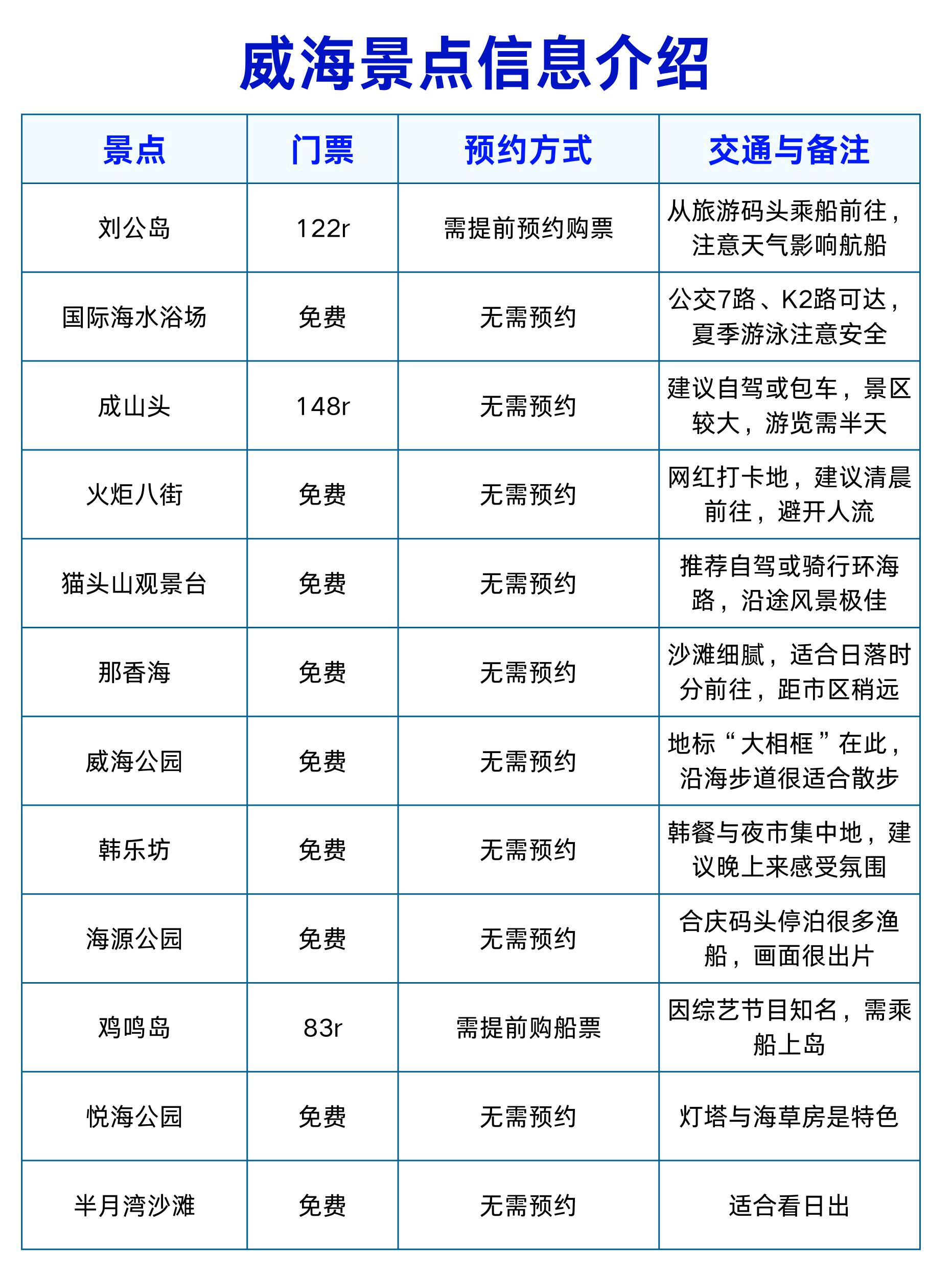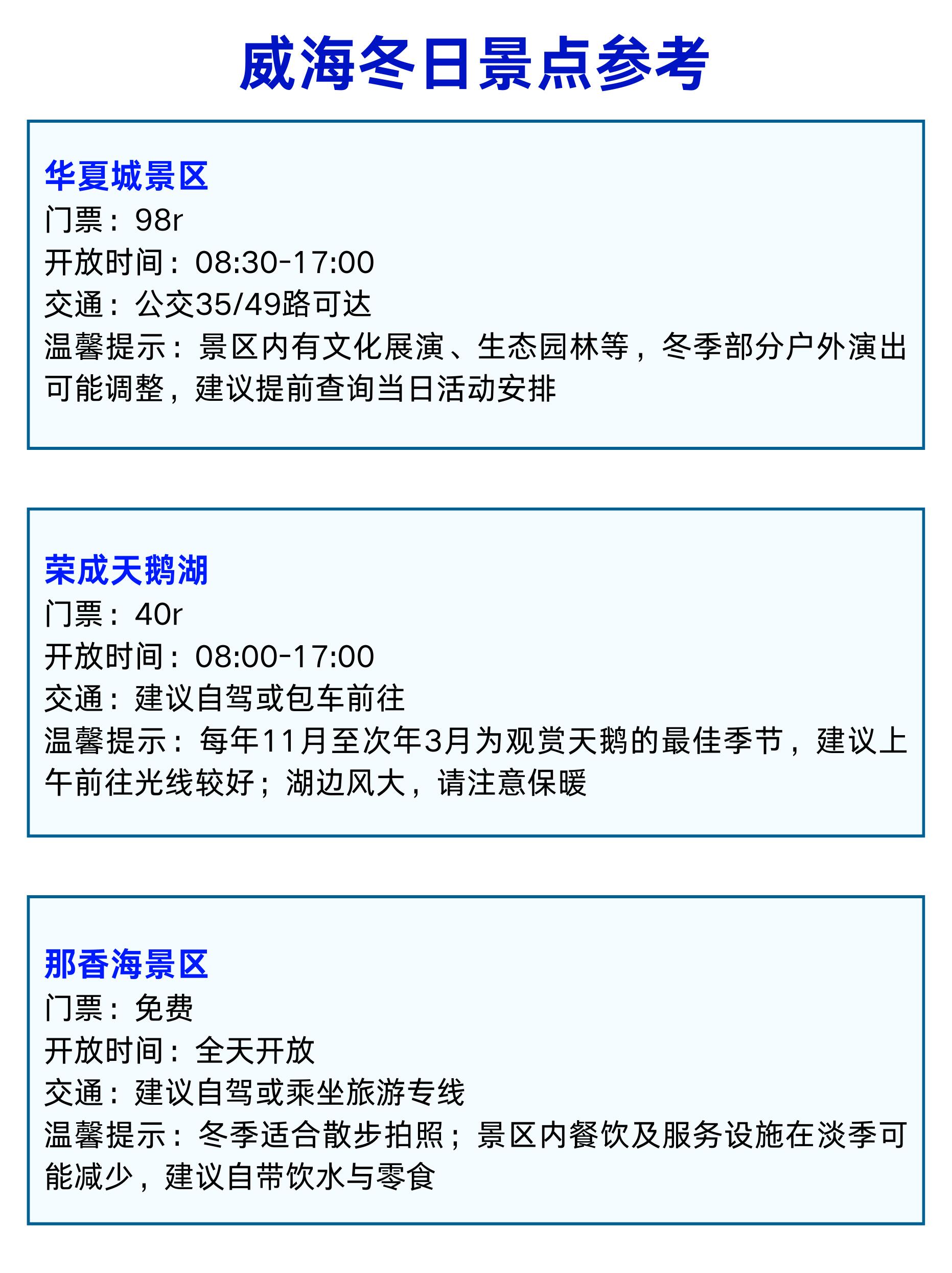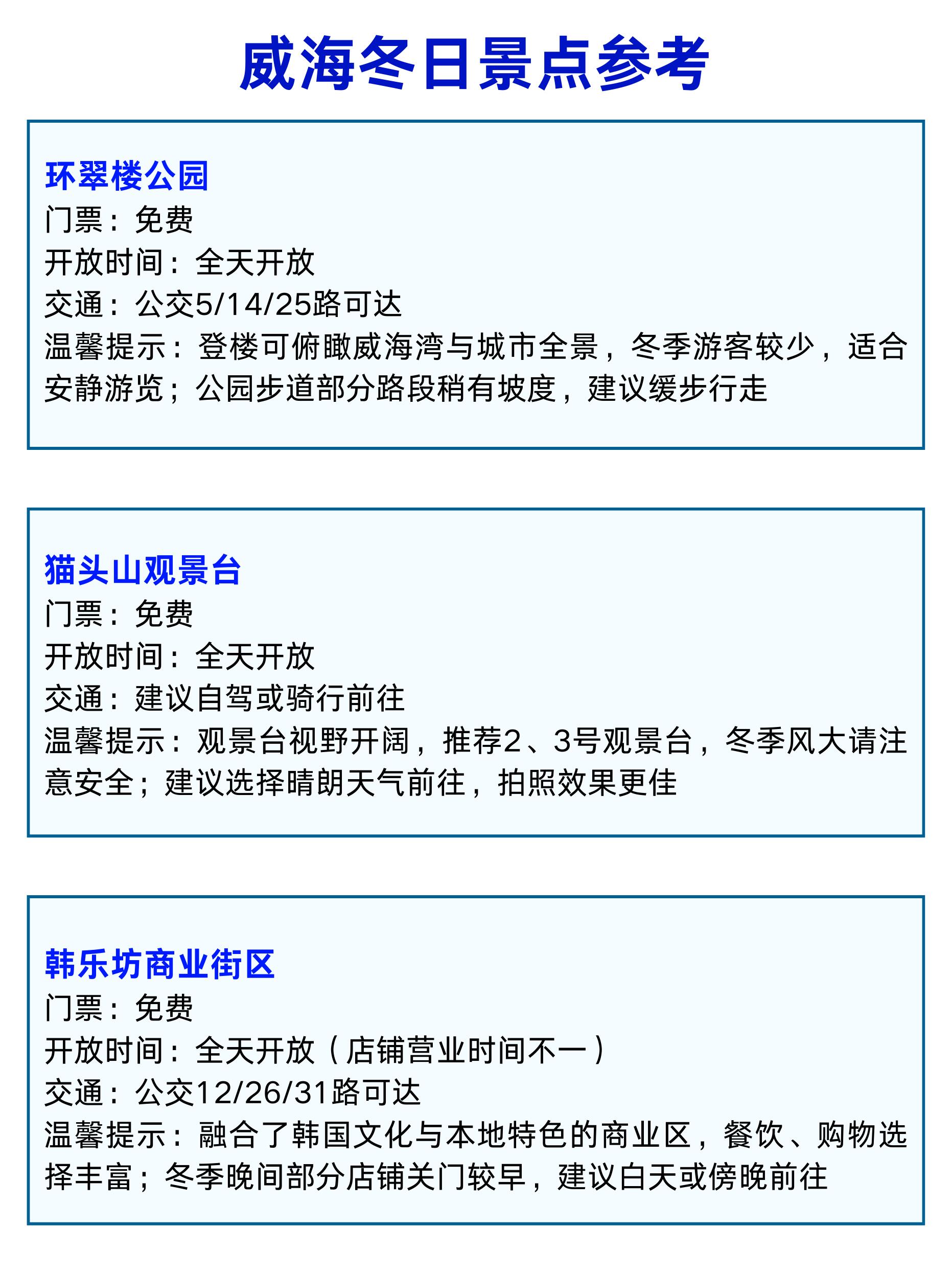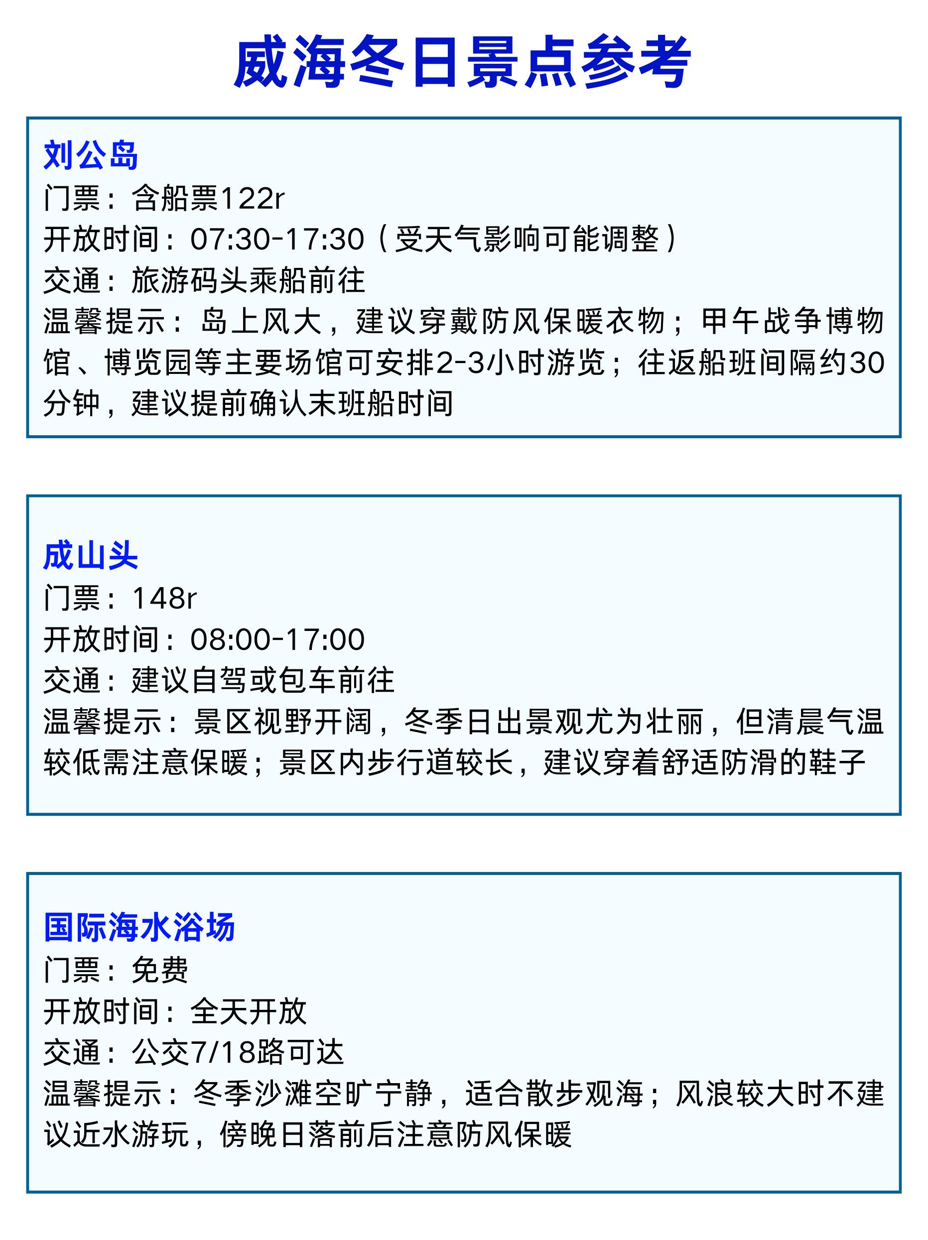 1️⃣ 威海冬季平均气温约-2℃至5℃,海风较大,体感温度较低。建议穿着加厚羽绒服、防风裤,并佩戴手套、帽子与围巾。润唇膏和护手霜可缓解干燥。部分户外景点(如刘公岛航线、环海路路段)可能因天气临时调整,建议行程预留弹性空间。市区及沿海住宿建议提前确认冬季供暖,及早预订。2️⃣ 计划参观威海市博物馆、图书馆、科技馆等公共场馆,建议出行前通过其官方渠道确认开放时间及预约政策。若想观察天鹅或海边漫步,请提前查询潮汐与天气状况,并遵守景区安全指引,勿进入未开放区域。