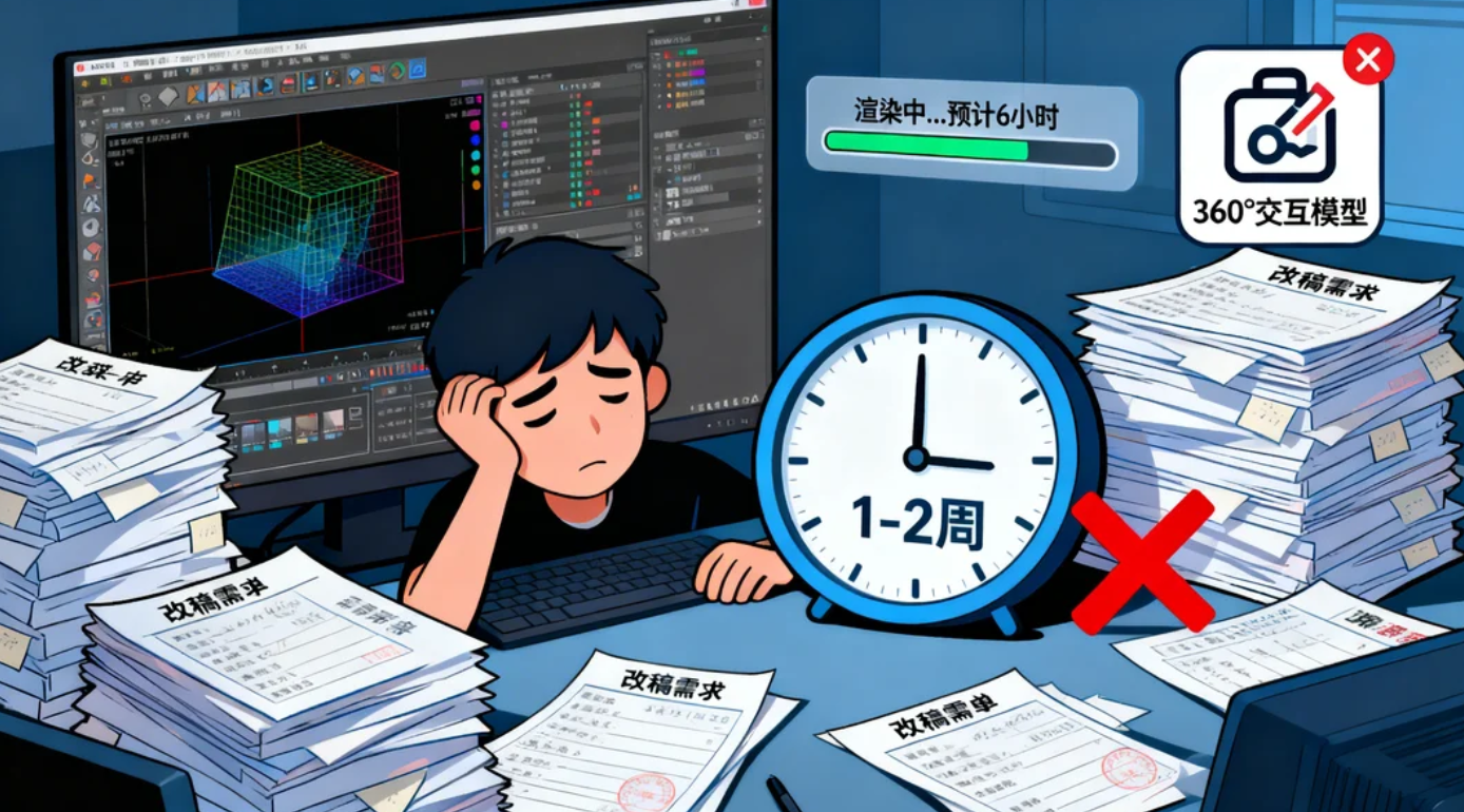 问题成因很简单:传统3D建模要么依赖外包,单价高、改稿慢;要么设计师自己用3D软件渲染,从搭棚、调参数到渲染图,一套下来耗时1-2周,等图出来商品可能都过时了。效率损耗更明显:运营想测款,设计师还在等渲染图;改一个细节,渲染几小时,沟通成本直线上升,最终导致转化没提升,反而白白增加时间和人力成本。