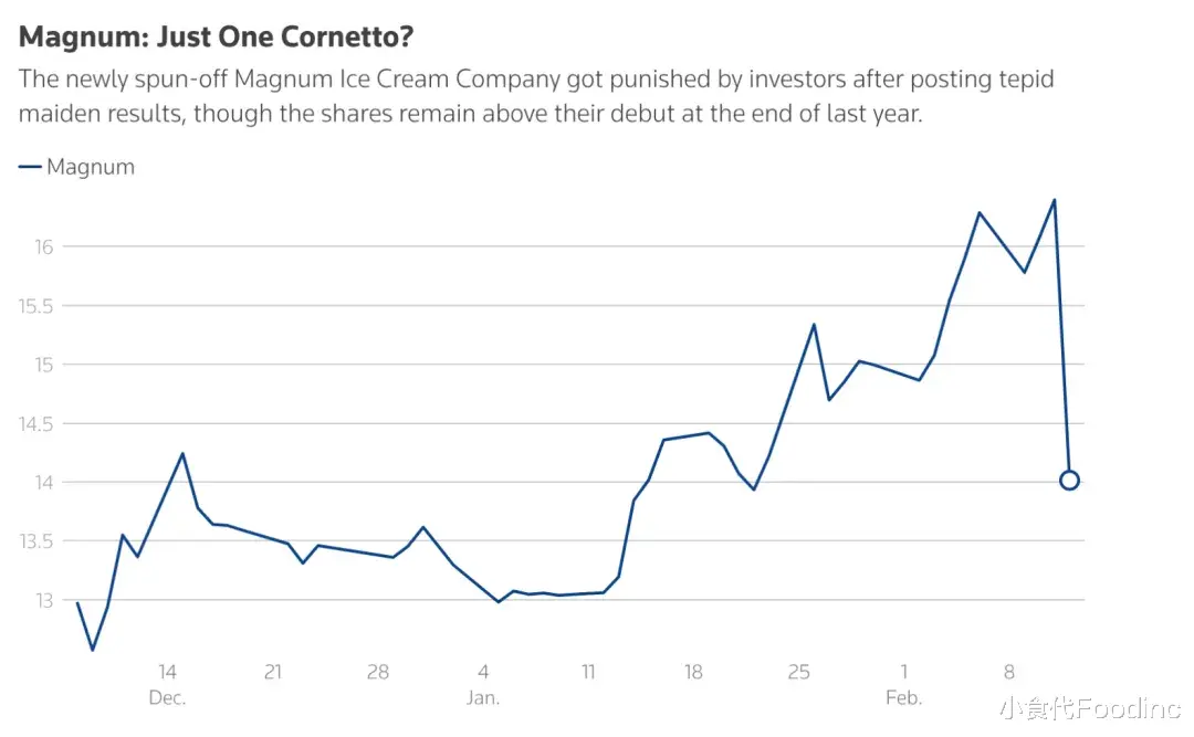 “梦龙股价自去年12月上市以来已累计上涨约30%,但如今正遭遇上市以来最大单日跌幅”路透引述市场人士指出:“从联合利华分拆出来,意味着这次财报难免混乱,毕竟拆分过程会产生一次性成本。不过,投资者对全年利润和现金流的大幅下滑仍感到失望。”