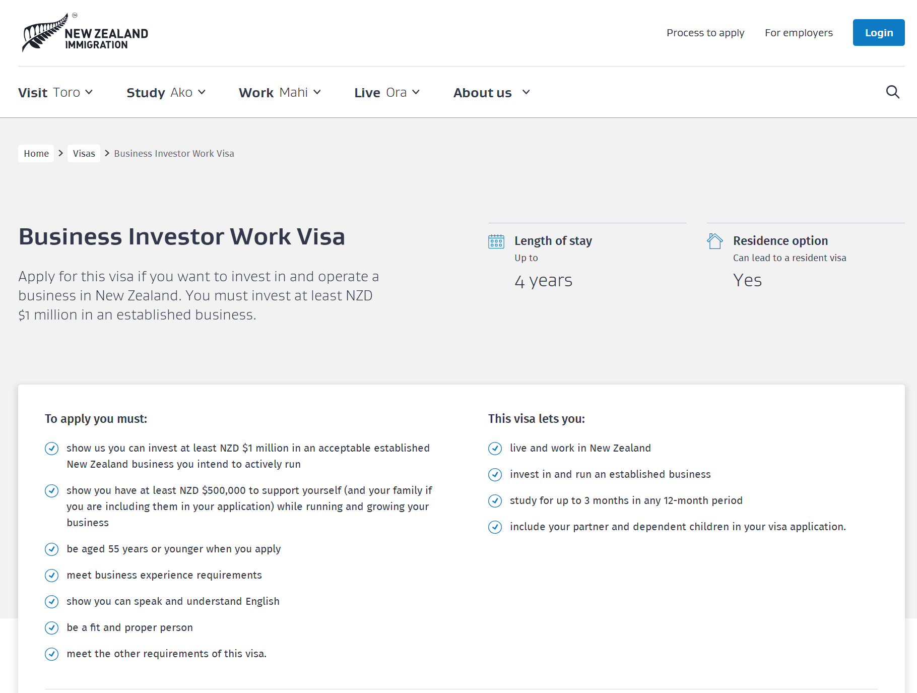 商业投资者工作签证100万纽币200万纽币5年50万纽币55岁曾拥有一家至少雇佣5名全职员工的企业;或