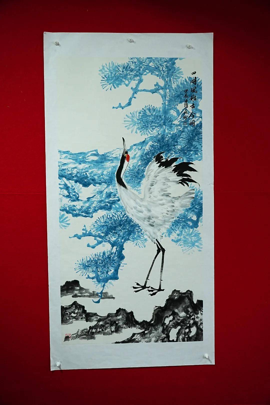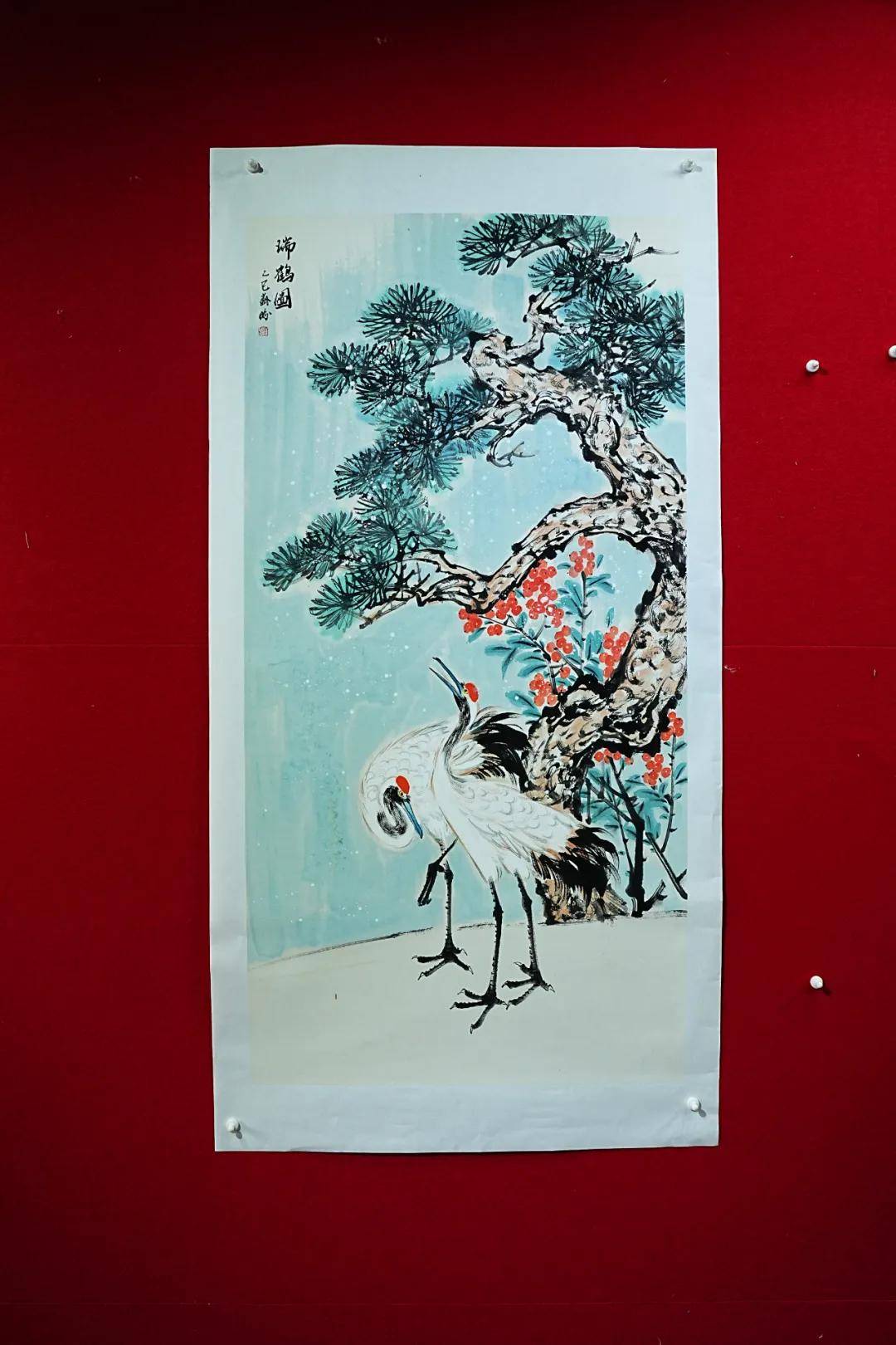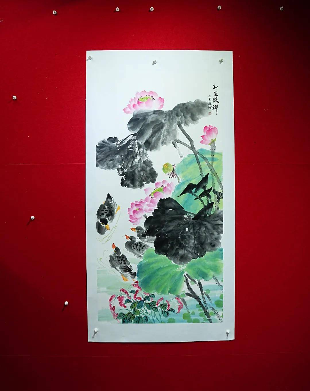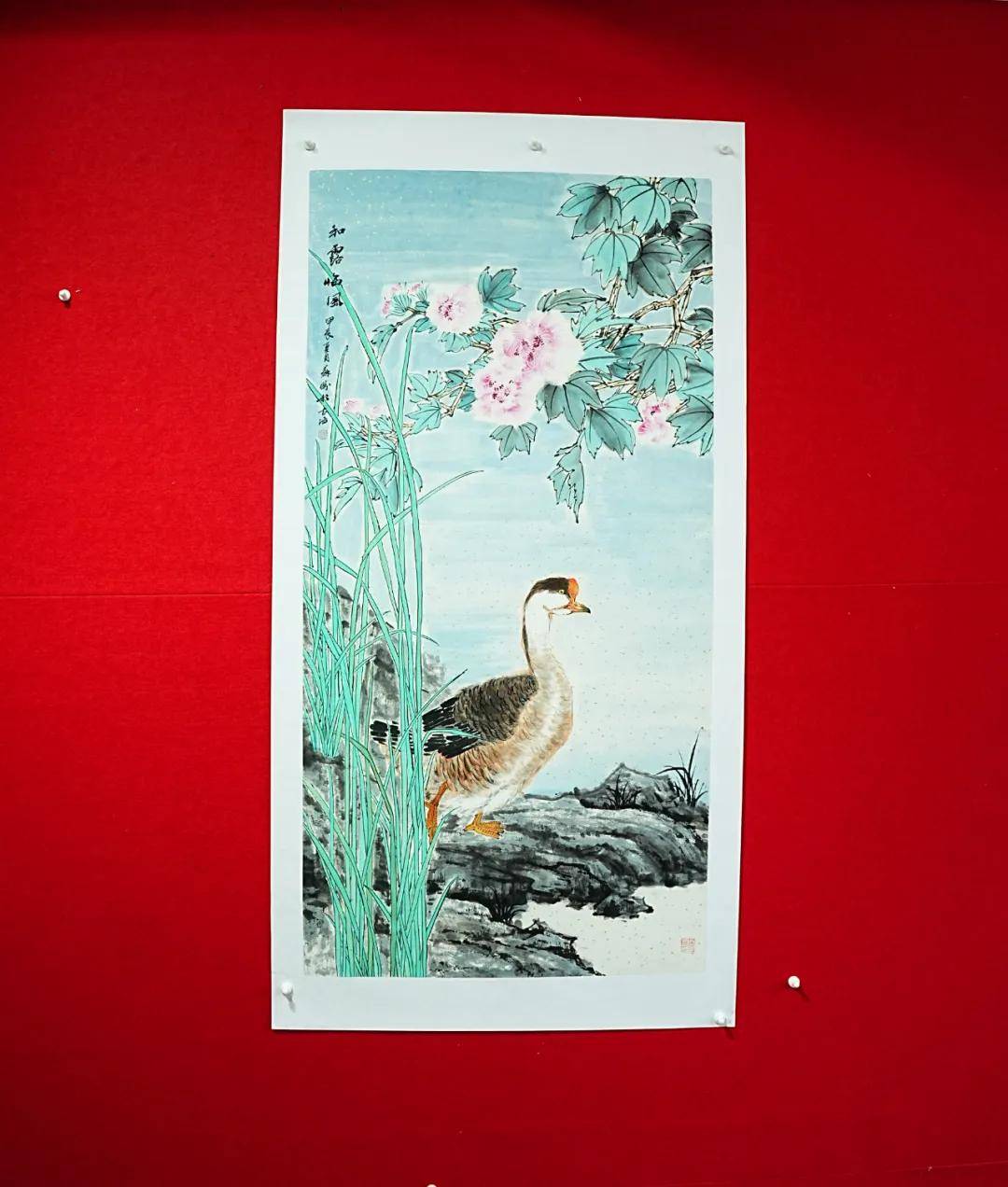 除牡丹与羊之外,苏盼的鹅、荷花、仙鹤作品亦可见正统功底。鹅的作品中,她借鹅之闲适展现从容自守的人生态度,暗合“达则兼济天下,穷则独善其身”的处世哲学;荷花作品里,花瓣娇嫩淡雅,荷叶高低错落,构图简洁却韵味悠长,既营造出“静影沉璧,暗香浮动”的意境,又暗合周敦颐“出淤泥而不染”的君子情怀;仙鹤作品则延续写意笔法,线条遒劲流畅,墨色浓淡相宜,既展现仙鹤的仙逸之姿,又传递出“松鹤延年”的传统意蕴,契合“寿考维祺,以介景福”的文化期许。