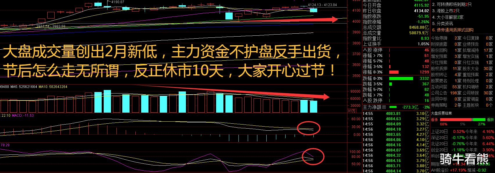 这次9天长假,对于金融行业的人来说就是“10天长假”,在记忆中还从来没有这么长的春节假期,全球金融市场依然是震荡中前行。A股市场本周指数护航明显,主力资金可谓是功不可没,但是成交量进一步萎缩,再加上资金热度下降,部分短线资金早就已经提前放假了,不过盘中仍然有个股大涨大跌,说明看好春节后的中线资金依然在努力。马年来临希望不要像蛇年一样迂回难上,更希望是平步青云一马当先往上冲的行情,投资者已经是“苦牛市久亦”。