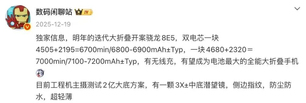 同一位博主以往的消息还曾提到过,“迭代大折叠开案骁龙8E5,双电芯一块4505+2195=6700min/6800-6900mAh±Typ,一块4680+2320=7000min/7100-7200mAh±Typ,有无线充,有望成为电池最大的全能大折叠手机。目前工程机主摄测试2亿大底方案,有一颗3X±中底潜望镜,侧边指纹,防尘防水,超轻薄”。