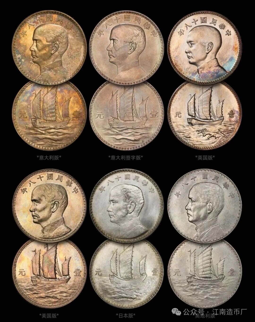 1929年南京国民政府为取代袁像币,邀请美国、奥地利、意大利、英国及日本五国造币厂雕刻孙像三帆银元模具并送样比稿的方案。